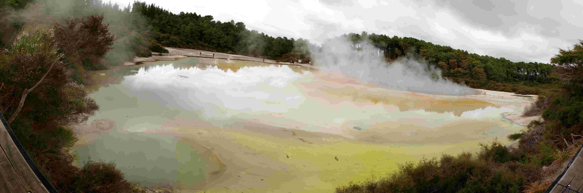 A Rotorua, impossible de ne pas renifler l'odeur « d'œuf pourri ». cette odeur de soufre est partout dans la ville. Nous prenons la route pour aller voir l'activité géothermique de la région à « Wai-o-tapu ». Ici, l'action acide souterraine a creusé le terrain formant des cratères, des piscines d'eau et de boue chaudes et froides ainsi que des fumerolles. En fonction des minéraux contenus dans le sol, des couleurs apparaissent, jaunes (soufre), oranges (oxyde de fer), ou bien vertes (arsenic). La température de l' eau ici oscille entre 70 et 100 degrés. Le parcours est très agréable, bien balisé et nous avons des explications en français ! C'est ensuite la découverte du Geyser Lady Knox qui jaillit tous les jours à 10h15 à presque 20m de haut. Mystère de la nature ou main de l'homme ??